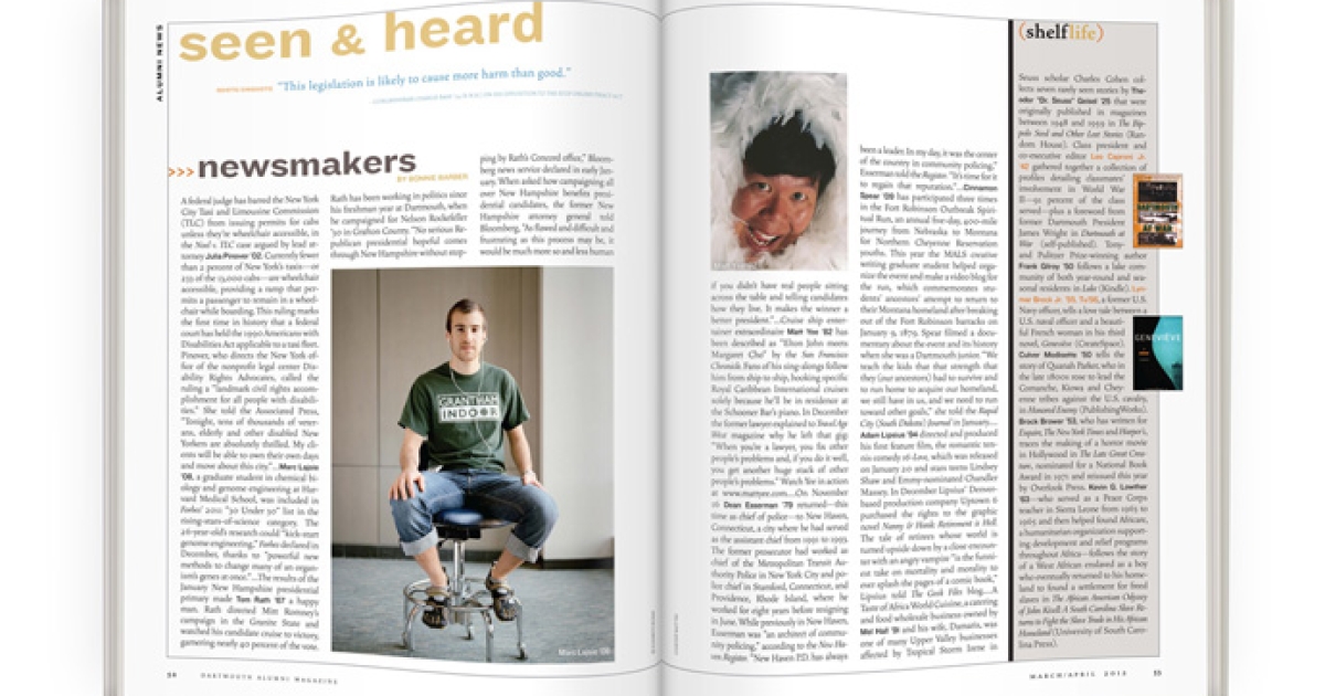 Marc Lajoie ’08, a graduate student in chemical biology and genome engineering at Harvard Medical School, was included in Forbes’ 2011 “30 Under 30” list in the rising-stars-of-science category. The 26-year-old’s research could “kick-start genome engineering,” Forbes declared in December, thanks to “powerful new methods to change many of an organism’s genes at once.”
