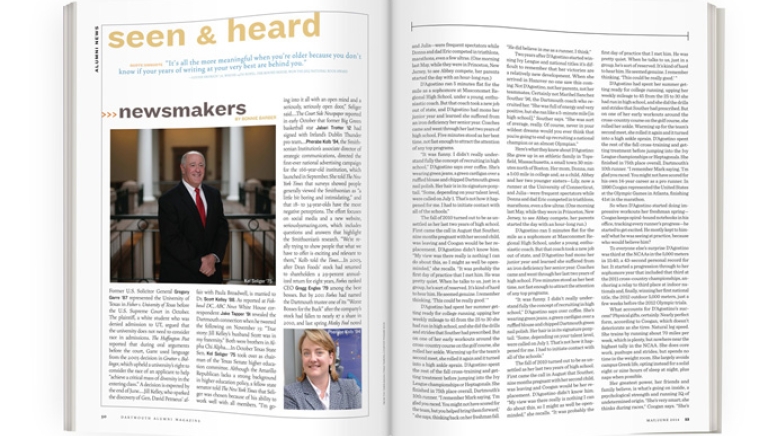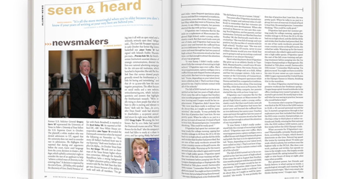 On Election Day several Dartmouth alumni won re-election or were elected to national office for the first time. Democrat Ann McLane Kuster ’78 defeated incumbent U.S. Rep. Charles Bass ’74 to become part of New Hampshire’s all-female congressional delegation. Democrat Michael Capuano ’73, the U.S. representative for Massachusetts’ eighth congressional district, won re-election as did Democrat John Carney ’78, the U.S. representative for Delaware’s at-large congressional district. In the U.S. Senate, New York Democrat incumbent Kirsten Gillibrand ’88 fended off a challenge by Republican Wendy Long ’82 and former Maine Gov. Angus King ’66, running as an independent, won the seat of retiring Republican Sen. Olympia Snowe.
