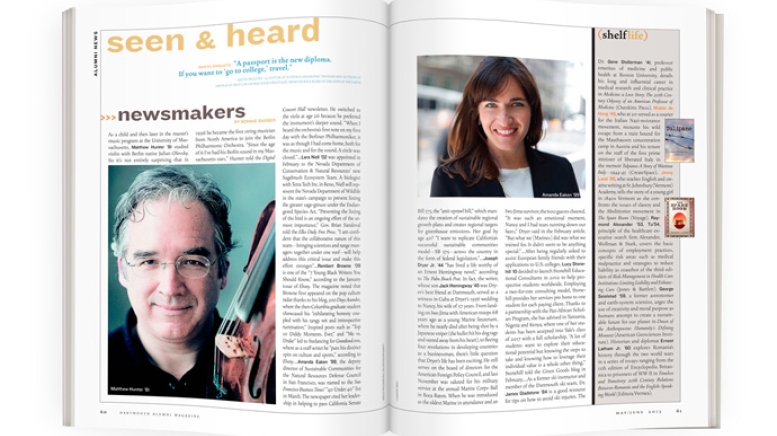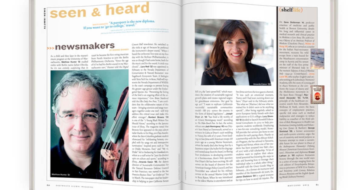 Amanda Eaken ’99, the deputy director of Sustainable Communities for the Natural Resources Defense Council in San Francisco, was named to the San Francisco Business Times’ “40 Under 40” list in March. The newspaper cited her leadership in helping to pass California Senate Bill 375, the “anti-sprawl bill,” which mandates the creation of sustainable regional growth plans and creates regional targets for greenhouse emissions. Her goal by age 40? “I want to replicate California’s successful sustainable communities model—SB 375—across the country in the form of federal legislation.”…