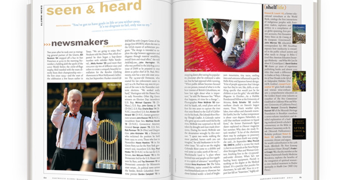Two years after he took over as managing general partner of the Giants, Bill Neukom ’64 stepped off a bus in San Francisco at 4:09 in the morning November 2 holding aloft the spoils of the 2010 World Series: the circle-of-flags trophy. He’d traveled with the team directly from their championship win—the first since 1954—and the start of the celebration a few hours earlier in Texas. “We are going to enjoy this,” Neukom told the Denver Post, which reported he then began a hop-dance number with infielder Pablo Sandoval.