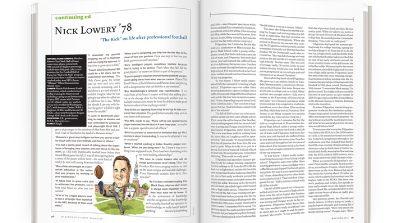 “Coach Jake Crouthamel ’60 could be a bit stern, but he understood psychology. The Holy Cross game my senior year we were tied 17-17 with six seconds remaining, and I had about a 40-yard attempt. I couldn’t imagine what he was going to say when he called me to sidelines but it was, ‘Who’s the blonde I saw you with before the game?’ I drilled it right down the middle.”