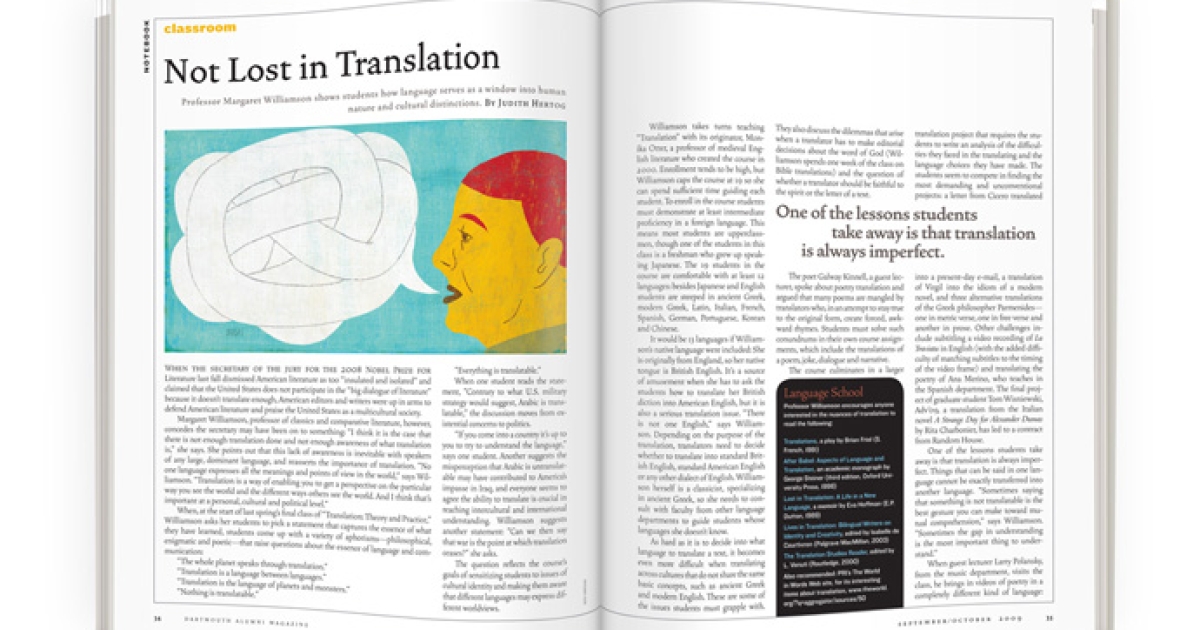 As hard as it is to decide into what language to translate a text, it becomes even more difficult when translating across cultures that do not share the same basic concepts, such as ancient Greek and modern English. These are some of the issues students must grapple with. They also discuss the dilemmas that arise when a translator has to make editorial decisions about the word of God (Williamson spends one week of the class on Bible translations) and the question of whether a translator should be faithful to the spirit or the letter of a text.