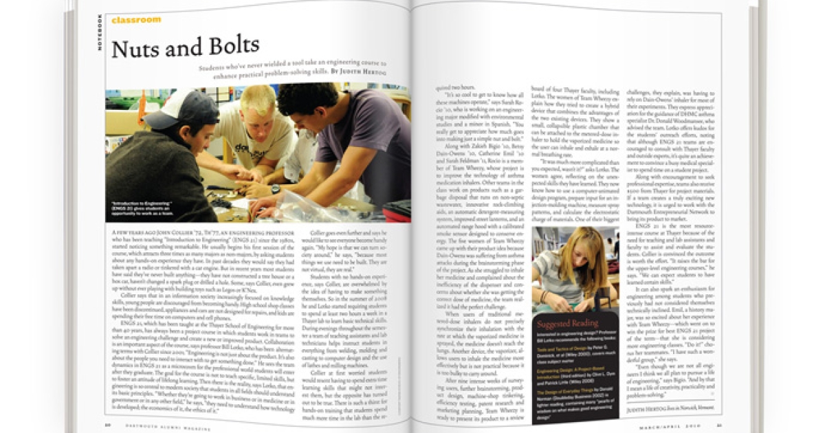 A few years ago John Collier ’72, Th’77, an engineering professor who has been teaching “Introduction to Engineering” (ENGS 21) since the 1980s, started noticing something remarkable. He usually begins his first session of the course, which attracts three times as many majors as non-majors, by asking students about any hands-on experience they have. In past decades they would say they had taken apart a radio or tinkered with a car engine. But in recent years most students have said they’ve never built anything—they have not constructed a tree house or a box car, haven’t changed a spark plug or drilled a hole. Some, says Collier, even grew up without ever playing with building toys such as Legos or K’Nex.