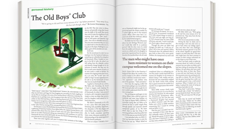 “She’s back!” cries Bob “The BobFather” Downey ’58, and before I can drop my ski boots and bags, he’s bear-hugging me, pounding my back, laughing in my ear. We are standing in the entry of his vacation home in Keystone, Colorado. Behind him are 20, perhaps more, men lounging in their after-ski wear. They have lively smiles on their life-lined faces. Many are wearing Dartmouth green. A few nod their heads at me in recognition, while others raise their glasses in cheer.