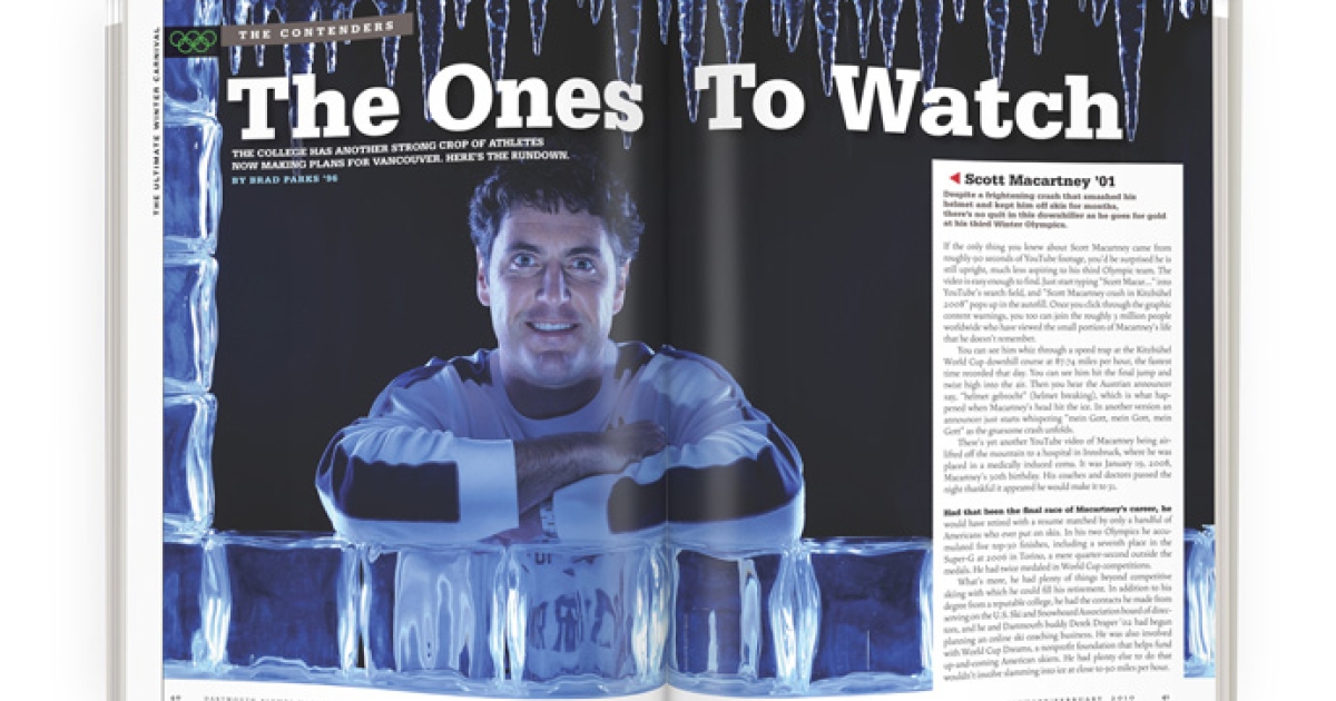 “That was one of the most dramatic crashes in the history of the sport,” says Bryon Friedman ’02, Macartney’s roommate at Dartmouth and on the U.S. ski team. “I probably would have quit the sport on the spot if I had been there to see that crash. But I never heard Scott talk once about quitting.”