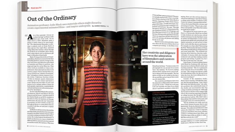 Outside of the animation studio, Mack enjoys running, rollerskating, singing, dancing and gardening. “I also collect flip books and kaleidoscopes,” she adds. As a professor she understands many of the doubts and uncertainties that dog college students pursuing art. Although she focused on theater at her magnet high school, she wound up majoring in English in college because she thought it was a more practical option. (She didn’t take a filmmaking class until her senior year, and eventually went on to earn her M.F.A.)