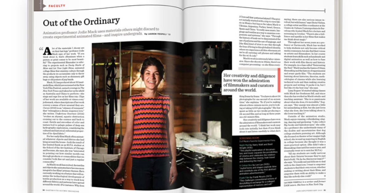 Throughout her seven years as a professor at Dartmouth, Mack has worked to help students not only become critical media consumers, but also find their voices as artists and filmmakers. In her course students learn skills such as handmade and digital animation as well as how to fuse their work with film theory and history. For example, in a class called “Reinventing the Reel,” Mack teaches the basics of 16mm filmmaking and the history of experimental and avant-garde film. “The students are learning about histories, theories, methodologies of cinema while also learning technical tools and then making creative projects and writing. It packs it in, but I feel like it’s the best way,” she says.