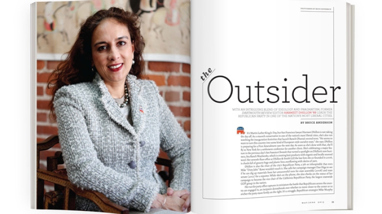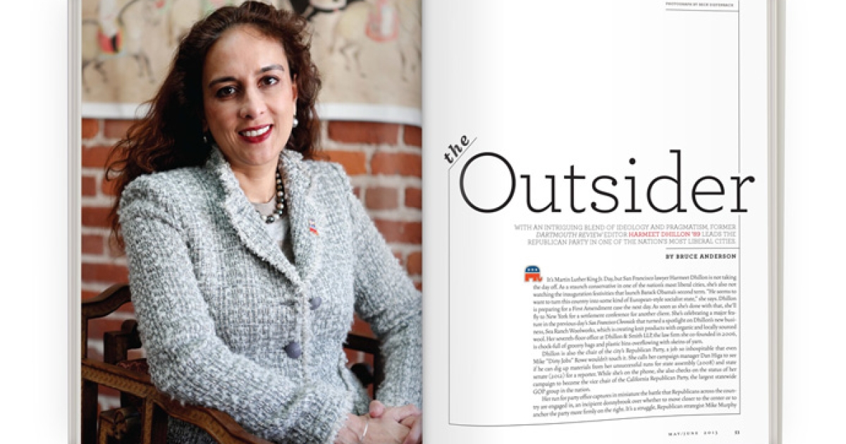 Dhillon also has a soft spot for the paper. “The Dartmouth Review gave me a tremendous opportunity to grow in self-confidence as a writer and as an advocate for particular ideas and ideologies,” she says. She allows that the Cole case “taught me the power of the law to be used for conservative causes.”