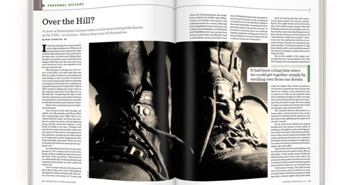 By now, though, every step hurt. During the first 30 miles of the hike I’d thought we should do it every year. For the next 20 miles I’d scaled back that plan to maybe doing another Fifty in 10 years or so. Now I found myself vowing never again to set foot off pavement. Then the trail turned right and we staggered onto the soccer field, dazed but done. Back at the Hanover Inn we discovered that the storm had knocked down two trees on the Green. Forget changing since we were students—Dartmouth wasn’t even the same as we’d left it the day before.