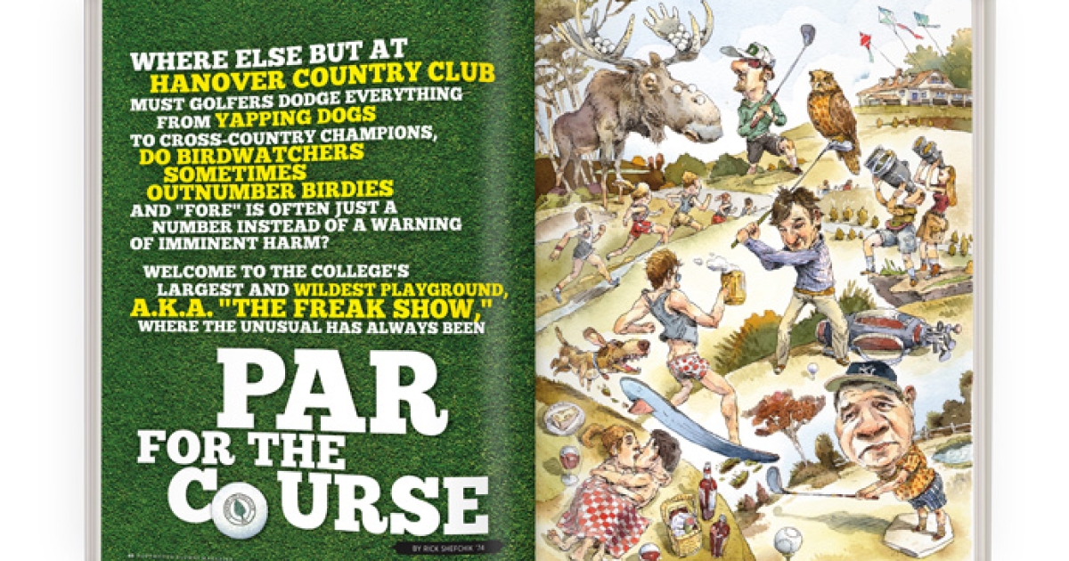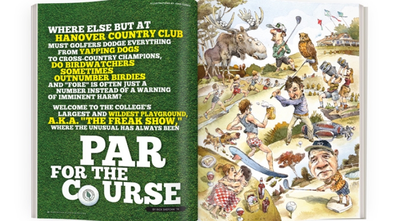 “Our group of guys affectionately refers to HCC as ‘the freak show,’ ” says Scott Peters, a former club champion who grew up playing HCC with his brother Mike, while his father, Seaver Peters ’54, was Dartmouth’s athletic director. “There are walkers, joggers, the cross-country team, sledding in winter—there’s always something walking or running past you on the golf course. I’ve been there so long I don’t even notice it anymore. That’s part of the charm of a college course.”