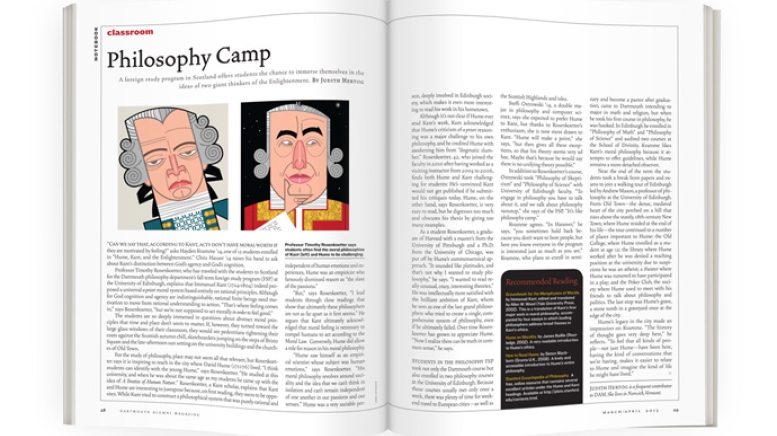 Professor Timothy Rosenkoetter, who has traveled with the students to Scotland for the Dartmouth philosophy department’s fall term foreign study program (FSP) at the University of Edinburgh, explains that Immanuel Kant (1724-1804) indeed proposed a universal a priori moral system based entirely on rational principles. Although for God cognition and agency are indistinguishable, rational finite beings need motivation to move from rational understanding to action. “That’s where feeling comes in,” says Rosenkoetter, “but we’re not supposed to act morally in order to feel good.”