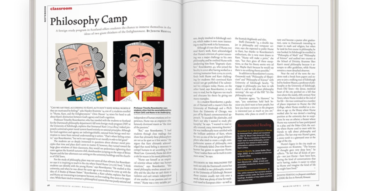 Steffi Ostrowski ’14, a double major in philosophy and computer science, says she expected to prefer Hume to Kant, but thanks to Rosenkoetter’s enthusiasm, she is now more drawn to Kant. “Hume will make a point,” she says, “but then gives all these exceptions, so that his theory seems very ad hoc. Maybe that’s because he would say there is no unifying theory possible.”