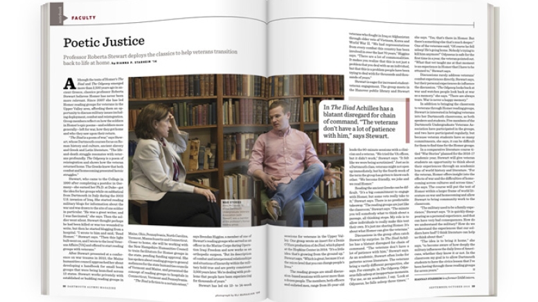 “The Iliad is a poem of war,” says Stewart, whose Dartmouth courses focus on Roman history and culture, ancient slavery and Greek and Latin literature. “The life-and-death struggle resonates with veterans profoundly. The Odyssey is a poem of reintegration and shows how the veteran returned home. The Greeks knew that both combat and homecoming presented heroic struggles.”