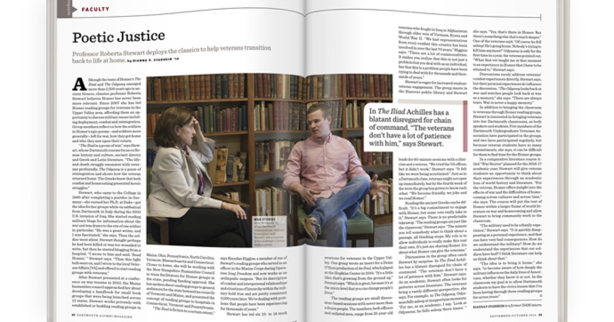 In addition to bringing the classroom to veterans through Homer reading groups, Stewart is interested in bringing veterans into her Dartmouth classrooms, as both speakers and students. Five members of the Dartmouth Undergraduate Veterans Association have participated in the groups, and two have participated regularly, but because veteran students have so many commitments, she says, it can be difficult for them to find time for the Homer groups.