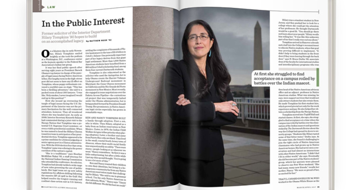 Tracy L. Canard Goodluck ’96, who worked in the Obama White House as the senior associate director of public engagement, remembers watching on C-SPAN in 2009 as Tompkins sat for her U.S. Senate confirmation hearings to take the role of solicitor for the Department of the Interior. When Canard Goodluck was a student, she had heard about Tompkins, because “we all knew who went before us. We are really connected to Dartmouth and to each other.” Canard Goodluck says she had a strong feeling Tompkins would be uniquely suited to navigate the treacherous legal issues that often arise between Native American tribes and the federal government. “You have to have a lot of patience, know your priorities,” Canard Goodluck says.