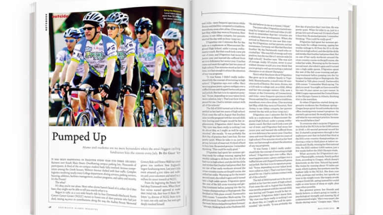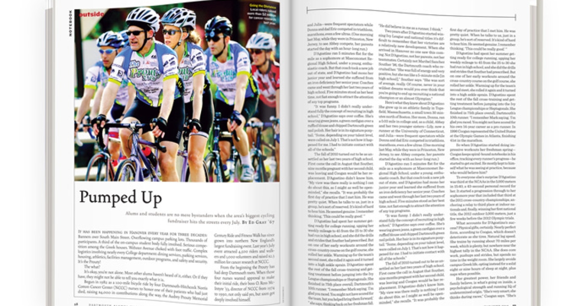 He’s far from alone. Hanover teacher Judy Csatari ’76 was awarded the prestigious 2009 Heart of the Prouty volunteer award. She had been recruited 10 years before by local realtor Starr Johnson ’70, and she in turn leaned on her daughter Emily ’99 to recruit her Alpha Xi Delta sisters to pitch in. “They manned a stop-and-go station, though they were loathe to use that verb,” laughs Csatari, whose husband, Tom ’74, bikes the Prouty every year. John Pepper ’91, Tu’97, and a team from his company, Boloco, rode and raised $25,000 last year—in addition to providing a couple of thousand burritos to feed the hungry post-ride horde that gathered at the Hanover middle school field.