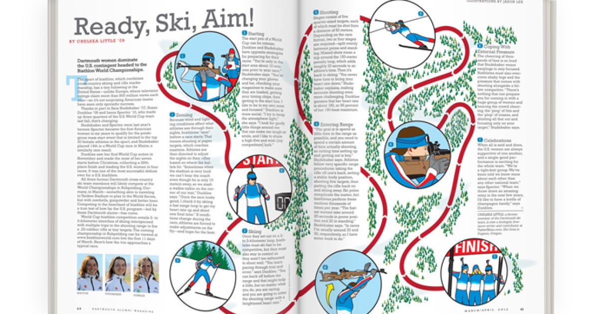All three former Dartmouth cross-country ski team members will likely compete at the World Championships in Ruhpolding, Germany, in March—something akin to traveling to Yankee Stadium to play in the World Series, but with cowbells, gunpowder and better beer. Competing in the heartland of biathlon will be a true test of how far the U.S. program—led by these Dartmouth alums—has come.