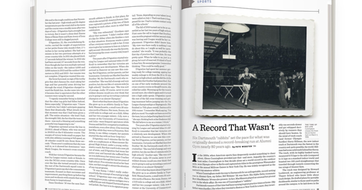 When Cunningham made his way to Dartmouth for an unforgettable, record-setting run in Alumni Gym, my father, Bill Webster ’39, was there. His Alpha Delta roommate Bert MacMannis ’39 was also present. In fact, MacMannis played an unusual but pivotal role in the whole affair: He was one of Cunningham’s “rabbits.”