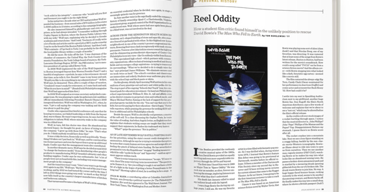 That night I struggled to write my review for The Dartmouth. I talked about Roeg’s arresting editing style, fantastic imagery and offbeat casting. I talked about the themes—of what it means to be an alien in America and of Newton’s “fall” to Earth, helpless against the decadent gravity of modern American consumer society. I described the film as “unique and challenging,” “thematically rich and complex” with “a winning performance by Bowie.” I also said that it was “often self-indulgent” and “certainly has its flaws.” The D published it with the headline, “New Roeg Film is Most Elusive.”