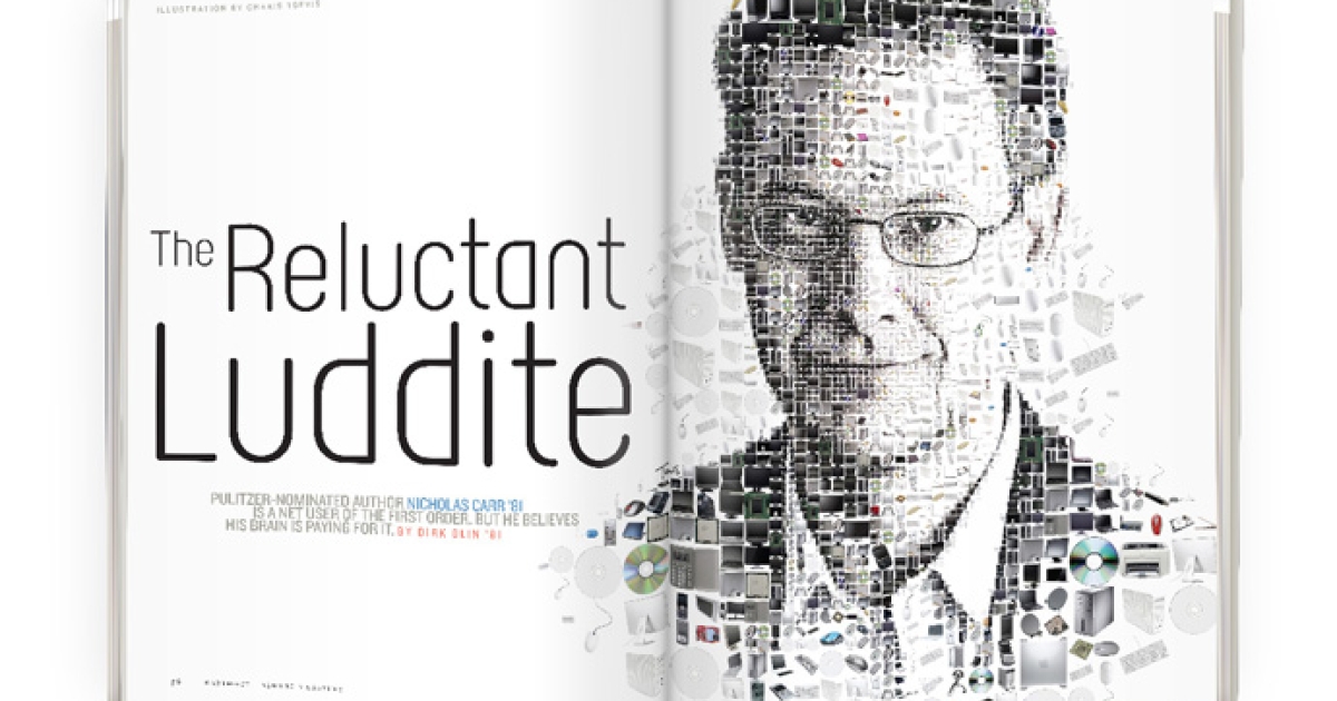 Carr’s biography makes sense in hindsight. Game player, English major, punk—he is now a journalist and leading iconoclast of the information age. He has written three books, with the most recent, The Shallows: What the Internet Is Doing to Our Brains, arguing that online overuse is infecting society with collective attention deficit disorder. The book earned Carr the title of Pulitzer finalist earlier this year.