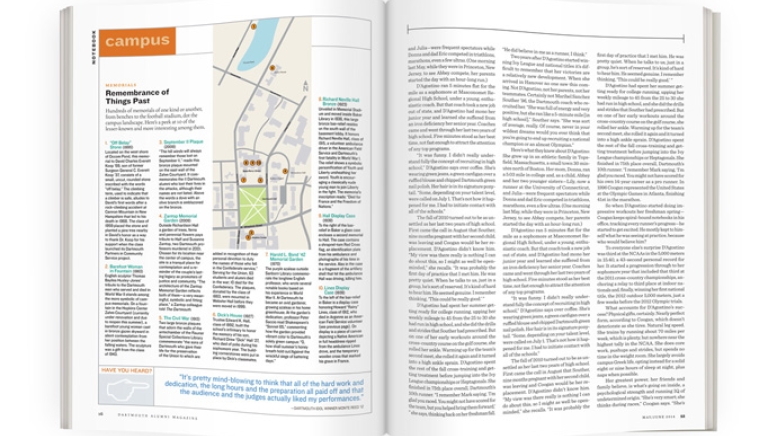 “The hill winds will always remember those lost on September 11,” reads this bronze plaque mounted on the east wall of the Zahm Courtyard. It commemorates the 11 Dartmouth alumni who lost their lives in the attacks, although their names are not listed. Above the words a dove with an olive branch is emblazoned on the bronze.