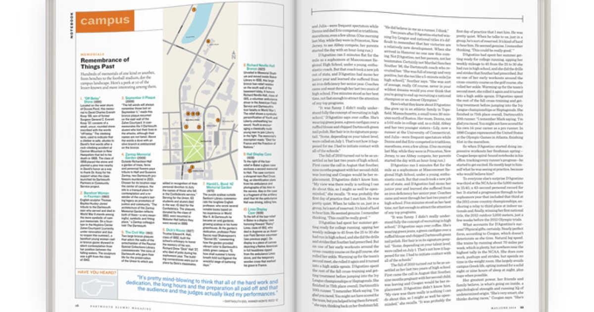 English sculptor Thomas Bayliss Huxley-Jones’ tribute to the Dartmouth men who served and died in World War II stands among the more symbolic of campus memorials. On a fountain in the Hopkins Center Zahm Courtyard (currently under renovation and due to reopen this summer), a barefoot young woman cast in bronze gazes skyward in silent contemplation from her position between the falling waters. The sculpture was a gift from the class of 1943.