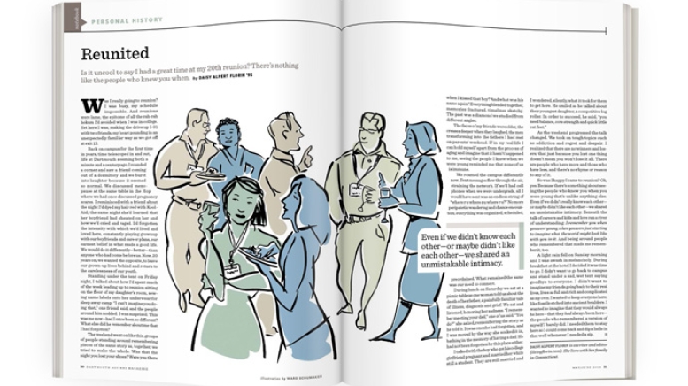 Back on campus for the first time in years, time telescoped in and out, life at Dartmouth seeming both a minute and a century ago. I rounded a corner and saw a friend coming out of a dormitory and we burst into laughter because it seemed so normal. We discussed menopause at the same table in the Hop where we had once discussed pregnancy scares. I reminisced with a friend about the night I’d dyed my hair red with Kool-Aid, the same night she’d learned that her boyfriend had cheated on her and how we’d cried and raged. I’d forgotten the intensity with which we’d lived and loved here, constantly playing grownup with our boyfriends and career plans, our earnest belief in what made a good life. We would do it differently—better—than anyone who had come before us. Now, 20 years on, we wanted the opposite, to leave our grown-up lives behind and return to the carelessness of our youth.