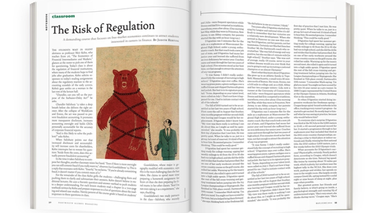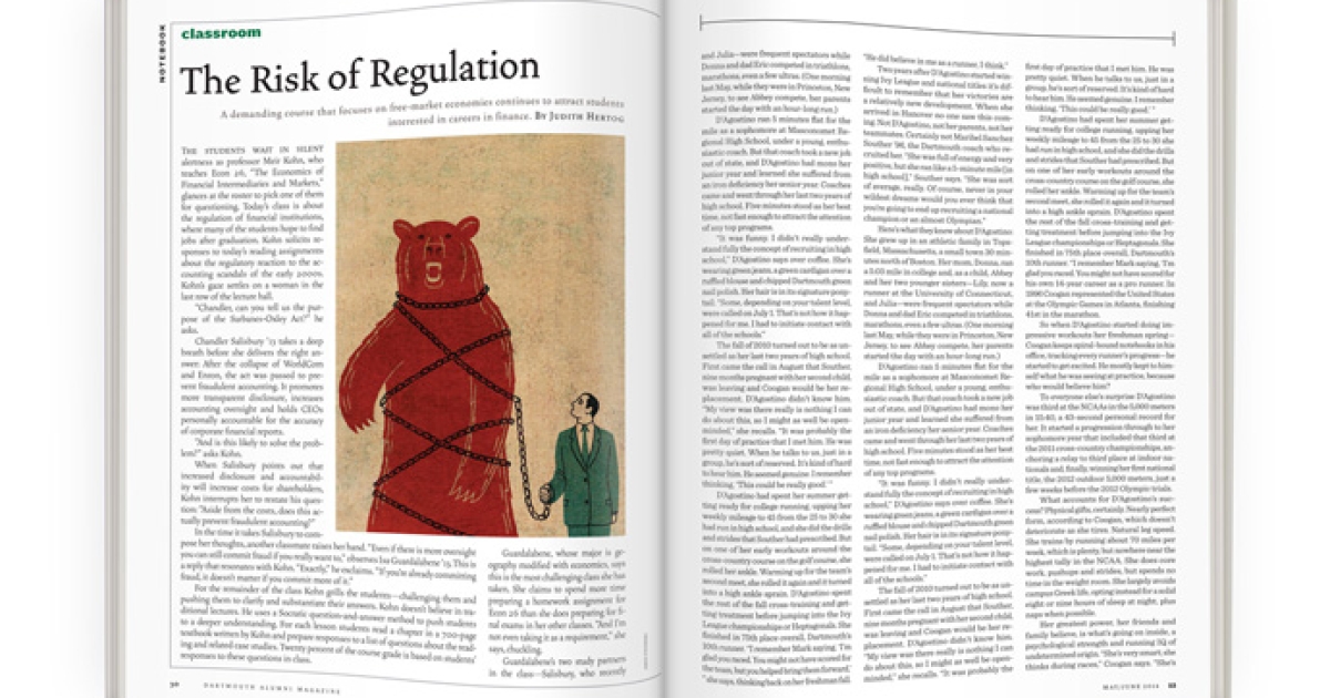 Before Kohn came to Dartmouth in 1978, Colin Campbell, a student of economist Milton Friedman, taught Econ 26 as “Money and Banking.” Campbell designed the course to counter the then-dominant Keynesian economic model—which advocates active government involvement in the economy—with a monetarist model that contends that government’s role in the economy should be limited to creating a stable money supply. Kohn continued his predecessor’s free-market approach but decided to focus more on financial institutions and less on monetary policy. Now in Econ 26 students learn about the nature and workings of securities markets and financial intermediaries such as banks, mutual funds and insurance companies. They also study the impact of regulation on the stability and efficiency of the financial system.