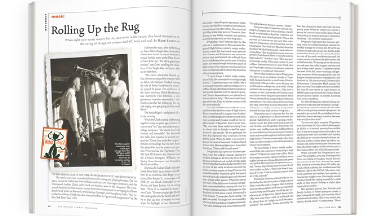 Dartmouth’s Indian Chiefs included Cook, Peter Bullis ’54 on banjo, Larry Elliott ’57 on trombone, John Berge ’57 on piano, Alan Shapiro ’57 on trumpet, Clif Olds ’57 and Chuck Schroeder ’57 on drums, and Barry Bockus ’56 on string bass. “None of us majored in music,” says Cook. “We were simply eight liberal arts undergrads with the desire and ability to play jazz hot. It became in many ways the highlight of our Dartmouth experience and an inspiration for a life-time of music.”
