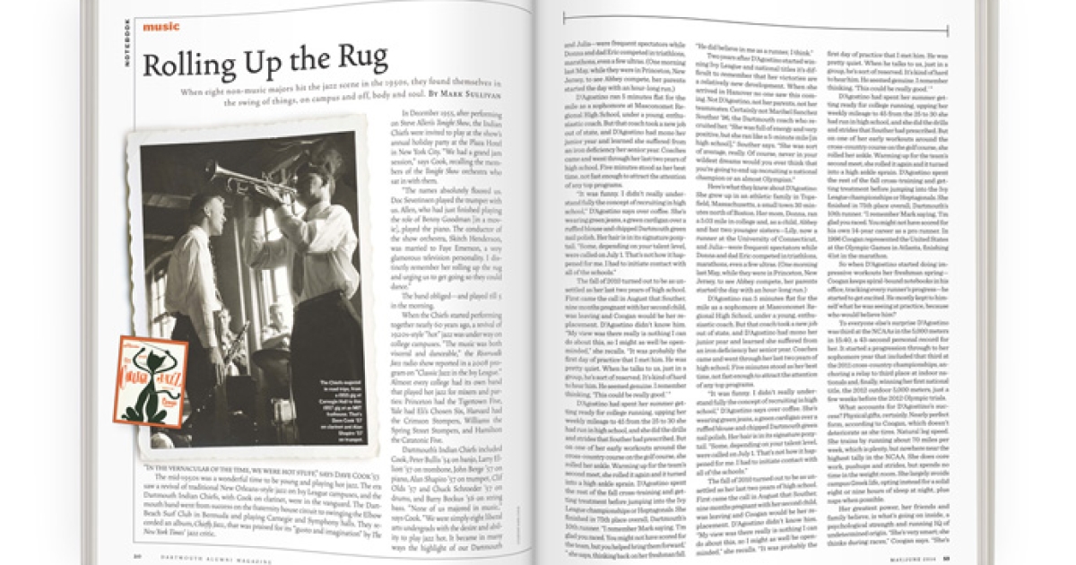 Certainly the Chiefs had the chops. Berge, a crowd favorite on piano, arrived at Dartmouth a classically trained musician who had mastered Beethoven’s Piano Concerto No. 1, recalls Cook, who lived in a neighboring dorm. “He also had a Hawaiian steel guitar, which he stuck in the window and played as loud as he possibly could. You couldn’t miss it for blocks. I heard that and said, ‘There’s a musician over there.’ ”