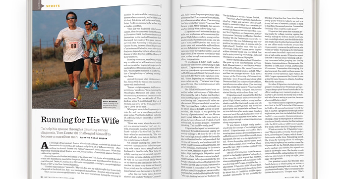 Dente discovered competitive running in his late 30s. In high school he ran freshman track but switched to football, where he says he developed into “a very bad reserve lineman.” In college he ran for fun with Jackson and Mike Grisham ’88 on loops around Occom Pond as well as across the Connecticut River and back up the hill to campus.