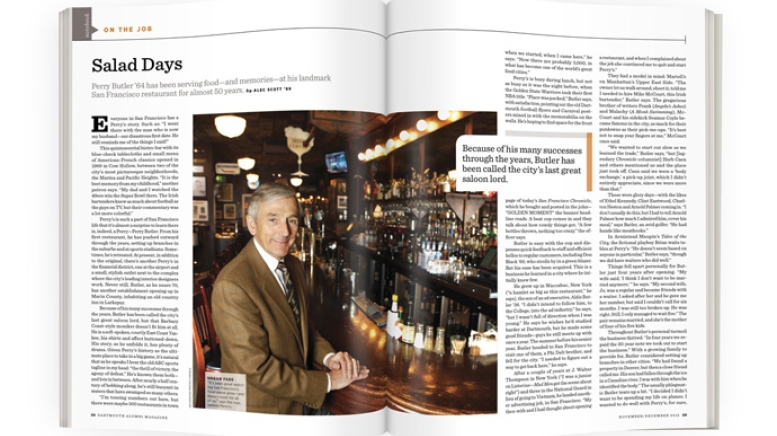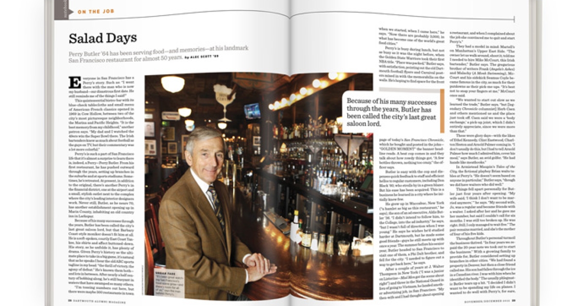 He grew up in Waccabuc, New York (“a hamlet as big as this restaurant,” he says), the son of an ad executive, Aldis Butler ’36. “I didn’t intend to follow him, to the College, into the ad industry,” he says, “but I wasn’t full of direction when I was young.” He says he wishes he’d studied harder at Dartmouth, but he made some good friends—guys he still meets up with once a year. The summer before his senior year, Butler headed to San Francisco to visit one of them, a Phi Delt brother, and fell for the city. “I needed to figure out a way to get back here,” he says.