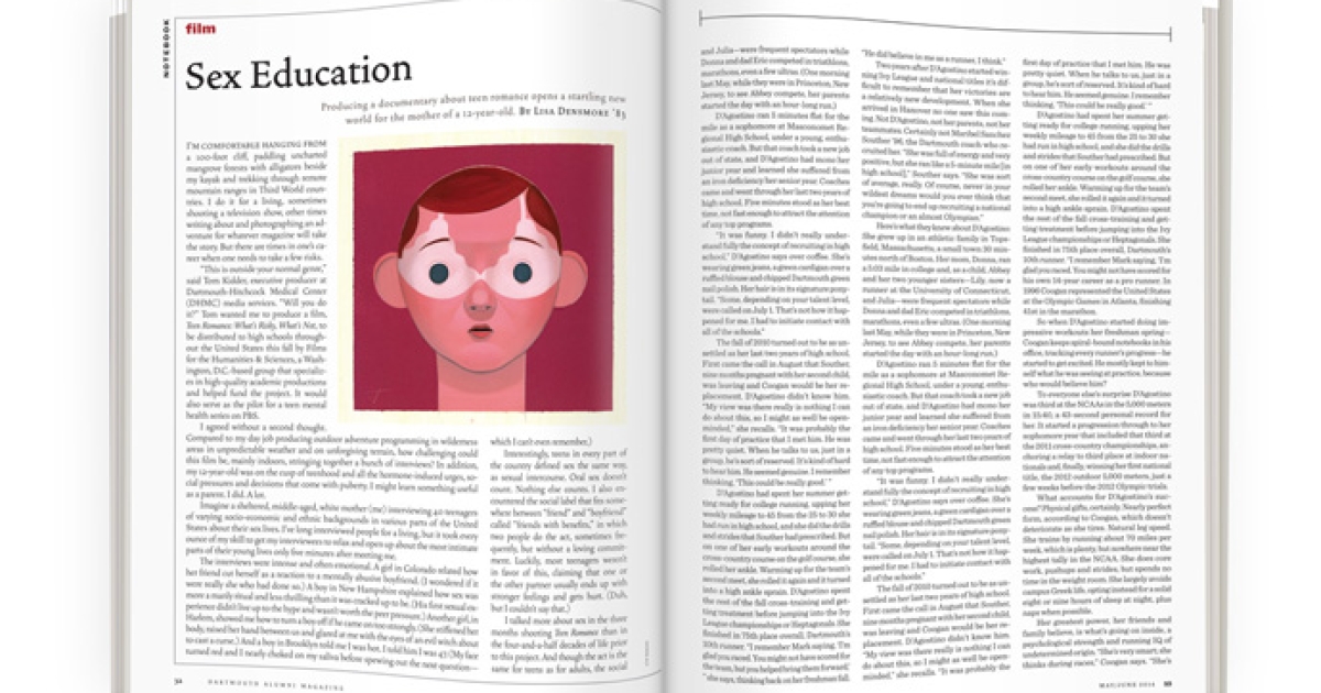 “This is outside your normal genre,” said Tom Kidder, executive producer at Dartmouth-Hitchcock Medical Center (DHMC) media services. “Will you do it?” Tom wanted me to produce a film, Teen Romance: What’s Risky, What’s Not, to be distributed to high schools throughout the United States this fall by Films for the Humanities & Sciences, a Washington, D.C.-based group that specializes in high-quality academic productions and helped fund the project. It would also serve as the pilot for a teen mental health series on PBS.
