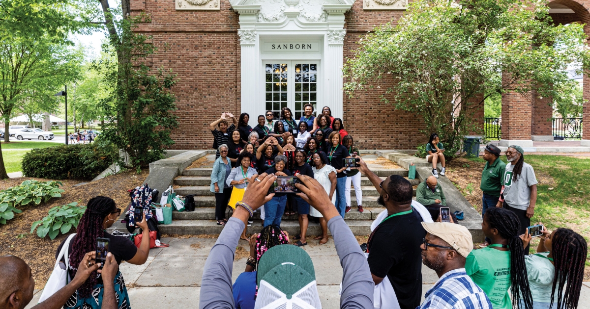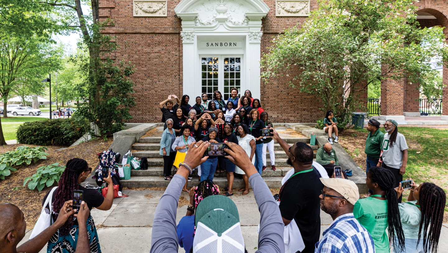 When the Black Alumni of Dartmouth Association gathered on campus in June, members had more to celebrate than the 50th anniversary of the group. Alumnae from the Pi Theta chapter of Delta Sigma Theta sorority also got around to commemorating their 35th anniversary, which had been postponed in 2020 because of the pandemic. For this photo op, sisters representing a range of class years, including charter members Rachel Kimboko ’87 (front row, second from left) and Cassandra Burns McDonald ’85 (front row, second from right), flashed their sorority hand signal.