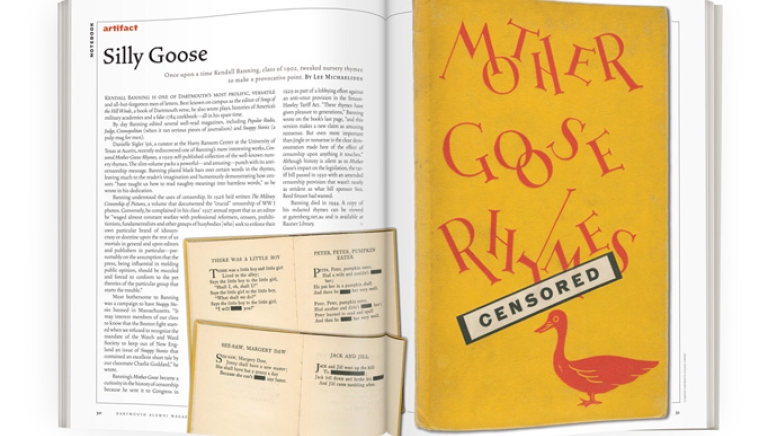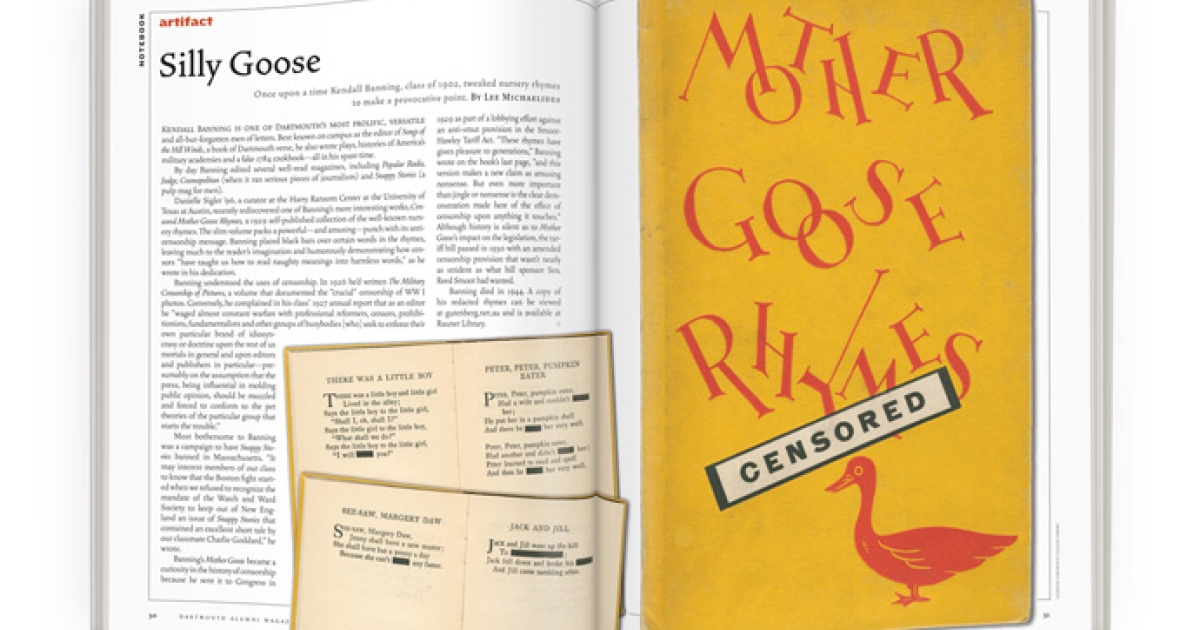 Danielle Sigler ’96, a curator at the Harry Ransom Center at the University of Texas at Austin, recently rediscovered one of Banning’s more interesting works, Censored Mother Goose Rhymes, a 1929 self-published collection of the well-known nursery rhymes. The slim volume packs a powerful—and amusing—punch with its anti-censorship message. Banning placed black bars over certain words in the rhymes, leaving much to the reader’s imagination and humorously demonstrating how censors “have taught us how to read naughty meanings into harmless words,” as he wrote in his dedication.
