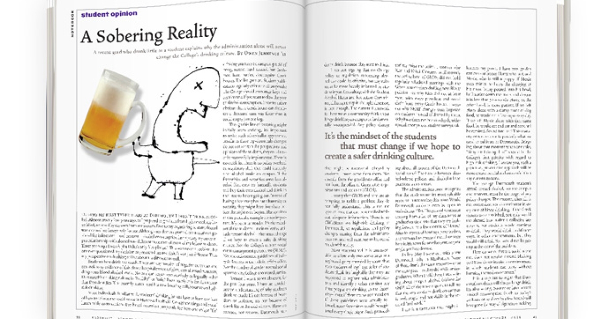In late May I went out with a few Dartmouth ’08s in Manhattan. None of them drank the same amount—or at the same pace—as they did while undergraduates. When I told them I was writing about campus alcohol (ab)use for DAM, all of them were quick to tell me that the way students drink on campus is both stupid and not viable in the so-called “real world.”