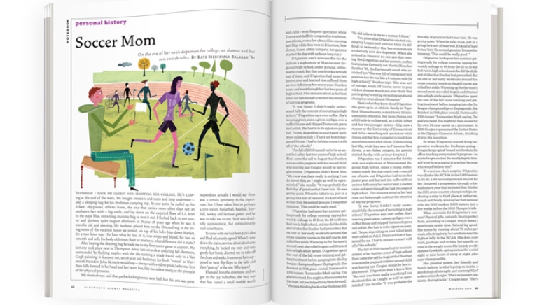 After buying the sleeping bag he took me to my first soccer game in 25 years. My last one took place next to Thompson Arena late on a clear and crisp fall afternoon, surrounded by flashing maples with the sky turning a shade found only in a Van Gogh painting. It featured me, an 18-year old freshman (or fresh “viman” as Dartmouth President John Kemeny would say—always with evident pride) who was less than fully formed in her head and her heart, but, like her oldest today, at the pinnacle of her physical prowess.