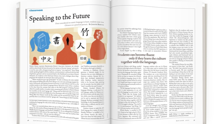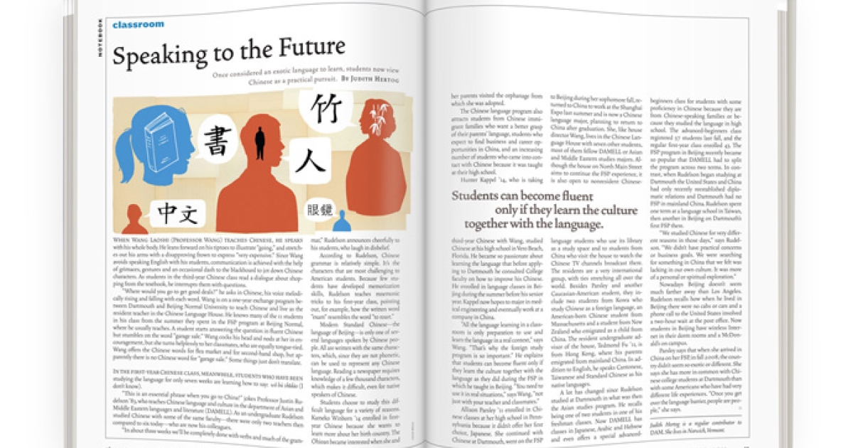A lot has changed since Rudelson studied at Dartmouth in what was then the Asian studies program. He recalls being one of two students in one of his freshman classes. Now DAMELL has classes in Japanese, Arabic and Hebrew and even offers a special advanced-beginners class for students with some proficiency in Chinese because they are from Chinese-speaking families or because they studied the language in high school. The advanced-beginners class registered 57 students last fall, and the regular first-year class enrolled 43. The FSP program in Beijing recently became so popular that DAMELL had to split the program across two terms. In contrast, when Rudelson began studying at Dartmouth the United States and China had only recently reestablished diplomatic relations and Dartmouth had no FSP in mainland China. Rudelson spent one term at a language school in Taiwan, then another in Beijing on Dartmouth’s first FSP there.