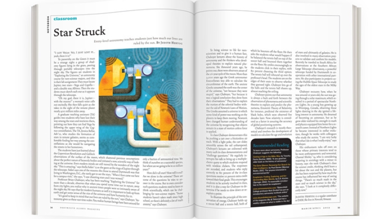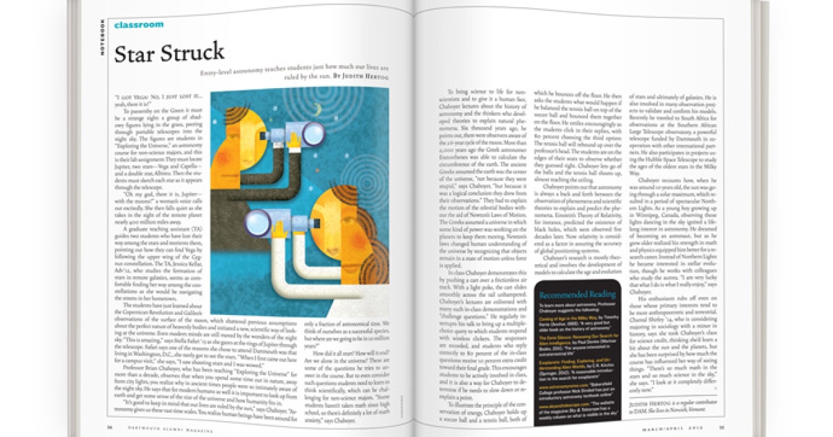 His enthusiasm rubs off even on those whose primary interests tend to be more anthropocentric and terrestrial. Chantal Shirley ’14, who is considering majoring in sociology with a minor in history, says she took Chaboyer’s class for science credit, thinking she’d learn a bit about the sun and the planets, but she has been surprised by how much the course has influenced her way of seeing things. “There’s so much math in the stars and so much science in the sky,” she says. “I look at it completely differently now.”