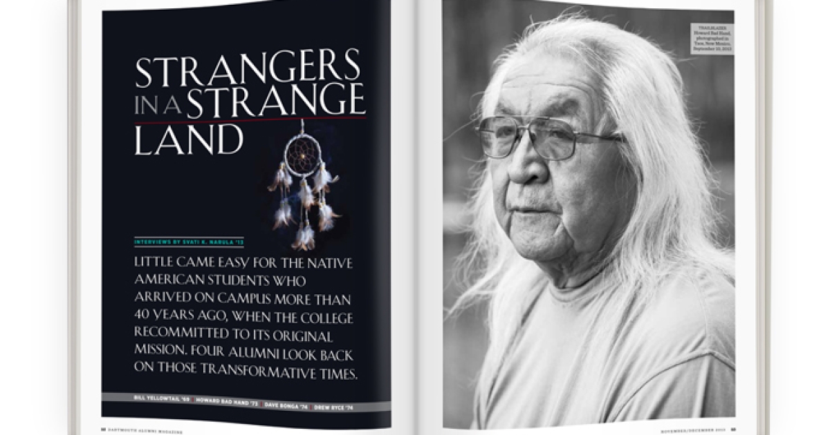 Dave Bonga: When we were recruited to Dartmouth, there were 15 of us from across the country. Three or four of our group already had that ABC tie with Dartmouth and knew what they were getting into. The majority of us had heard of Dartmouth only through the Indian education grapevine. I heard of it from my aunt, who worked at the Bureau of Indian Affairs in Washington, D.C.