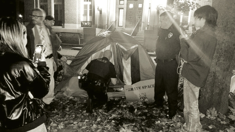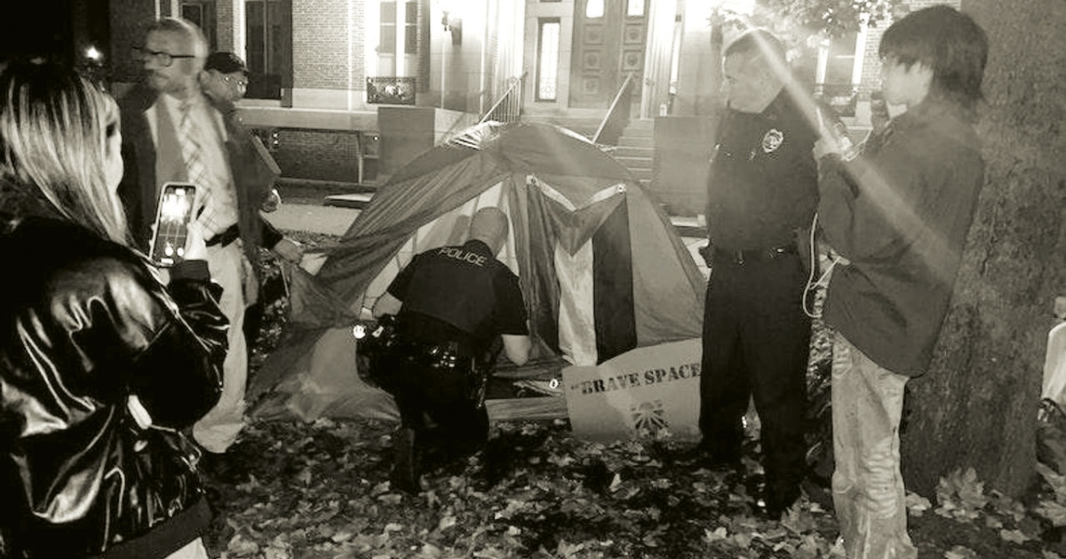 At the direction of Dartmouth leadership, Hanover police arrested two students on October 28 and charged them with criminal trespassing, a misdemeanor. At 1 a.m.that Saturday, officers handcuffed Roan Wade ’25 and Kevin Engel ’27 and removed them from the lawn in front of the president’s office, where they had erected a tent fronted by a sign that read “Brave Spaces.”