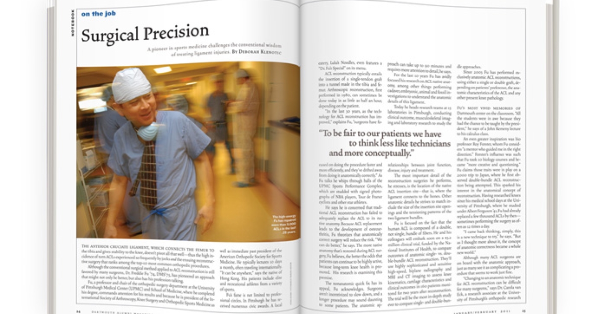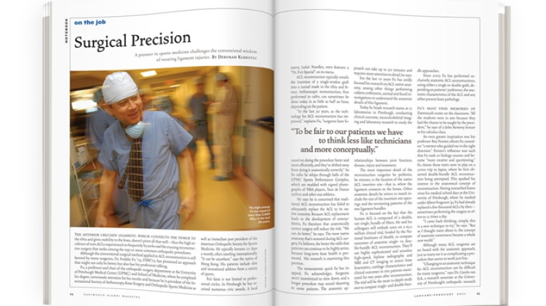 An even greater inspiration was bio professor Roy Forster, whom Fu considers “a mentor who guided me in the right direction.” Forster’s influence was such that Fu took 10 biology courses and became “more creative and questioning.” Fu claims those traits were in play on a 2000 trip to Japan, where he first observed double-bundle ACL reconstruction being attempted. This sparked his interest in the anatomical concept of reconstruction. Having researched knees since his medical school days at the University of Pittsburgh, where he studied under Albert Ferguson ’41, Fu had already replaced a few thousand ACLs by then—sometimes performing the surgery as often as 12 times a day.