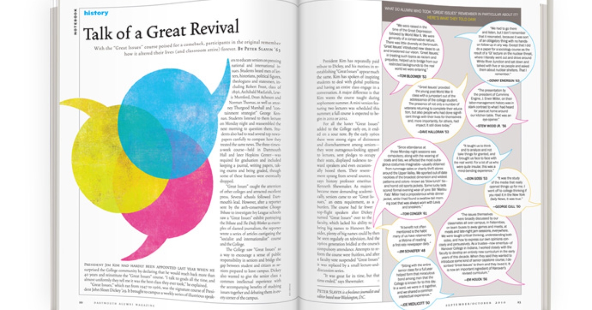President Jim Kim had hardly been appointed last year when he surprised the College community by declaring that he would reach back more than 40 years and reinstitute the “Great Issues” course. “I talk to grads all the time, and almost uniformly they tell me it was the best class they ever took,” he explained.