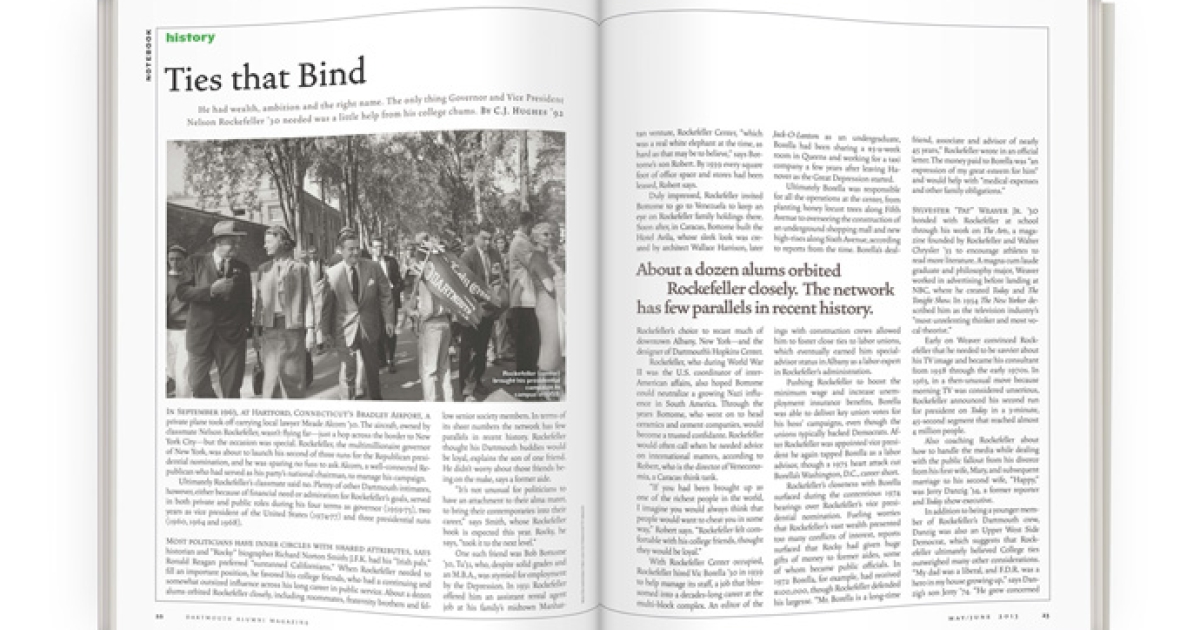 Ultimately Rockefeller’s classmate said no. Plenty of other Dartmouth intimates, however, either because of financial need or admiration for Rockefeller’s goals, served in both private and public roles during his four terms as governor (1959-73), two years as vice president of the United States (1974-77) and three presidential runs (1960, 1964 and 1968).