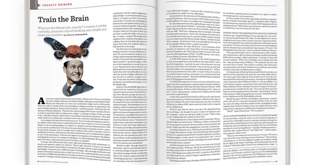 The same premise underlies our own system of liberal education. The standard liberal arts curriculum is designed to ensure that students, upon completing their course of study, will have mastered the basic grammars of critical thought in order to then tackle, with creativity, reason, and inspiration, the more specialized tasks of professional life. This is why careers often have so little relationship to majors. Dartmouth, for example, has educated two U.S. treasury secretaries, yet neither of them majored in economics or government: Hank Paulson ’68 was an English major and Timothy Geithner ’83 majored in Asian and Middle Eastern studies. Plenty of other Dartmouth alumni defy the perceived link between major and careers: Jake Tapper ’91, CNN’s chief Washington correspondent, majored in history; Phil Lord ’97 and Chris Miller ’97, who wrote and directed The Lego Movie and directed 21 Jump Street, majored in art history and studio art, respectively. Michael Arad ’91, the architect of the World Trade Center memorial, was a government major. It is also why so many successful people appear to have had such varied paths. It is precisely because they are not pigeonholed into a single vocation and thus a single career path that they have the enviable ability to make and take new professional opportunities. This is what I mean by the creative application of knowledge.