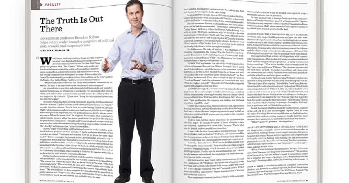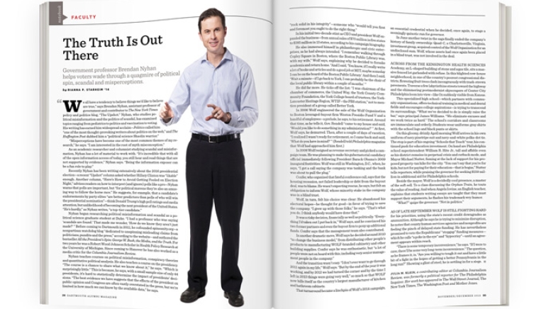 Nyhan began researching political misinformation and scandal as a political science graduate student at Duke. “I had a professor who was saying ‘scandals are found.’ That made me wonder, ‘How do we know they aren’t just made?’ ” Before coming to Dartmouth in 2011, he cofounded spinsanity.org—a nonpartisan watchdog blog “dedicated to unspinning misleading claims from politicians, pundits and the press,” according to the website—and authored the bestseller All the President’s Spin: George W. Bush, the Media, and the Truth. For two years he was a Robert Wood Johnson Scholar in Health Policy Research at the University of Michigan. Since coming to Hanover he has also worked as a media critic for the Columbia Journalism Review.