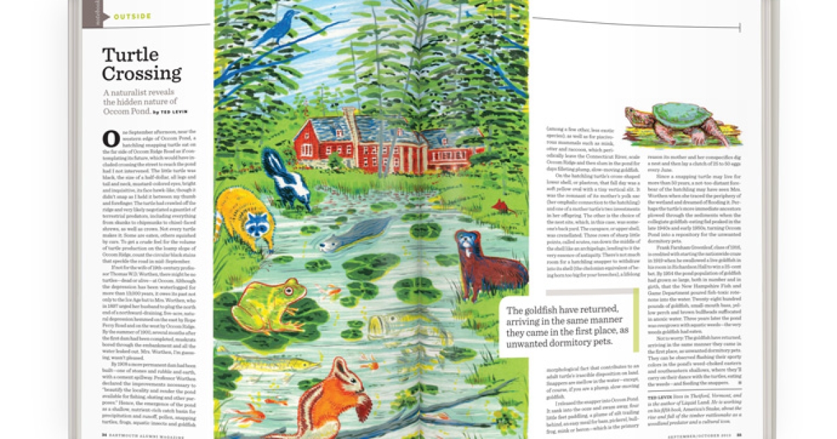 Since a snapping turtle may live for more than 50 years, a not-too-distant forebear of the hatchling may have seen Mrs. Worthen when she traced the periphery of the wetland and dreamed of flooding it. Perhaps the turtle’s more immediate ancestors plowed through the sediments when the collegiate goldfish-eating fad peaked in the late 1940s and early 1950s, turning Occom Pond into a repository for the unwanted dormitory pets.