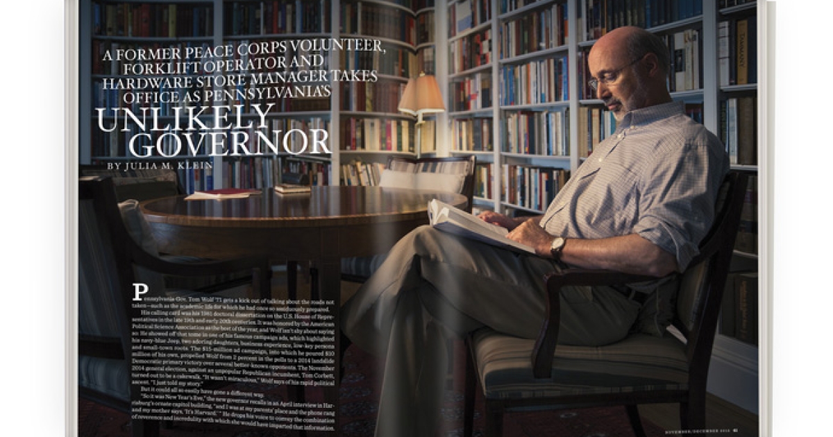 Pennsylvania Gov. Tom Wolf ’71 gets a kick out of talking about the roads not taken—such as the academic life for which he had once so assiduously prepared.
