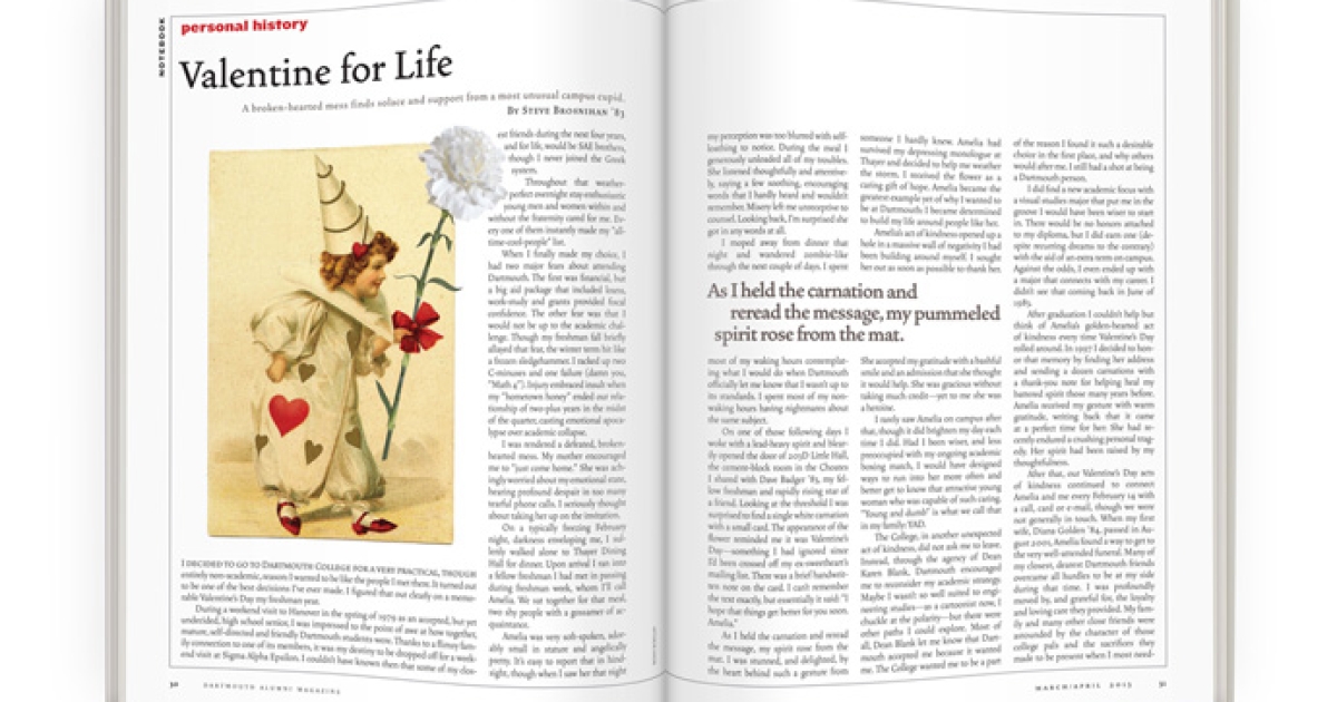 Many 14ths of February have come and gone for Amelia and me since that cold, miserable winter of my freshman year, but our warm connection as Dartmouth valentines remains undying.
