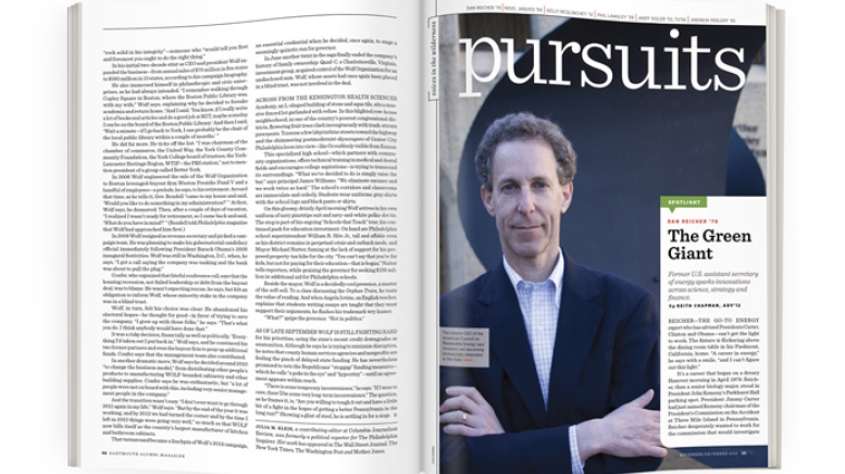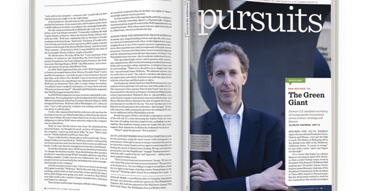 It helps that he has worked in each: Reicher has spent a good part of his career in Washington, D.C., but he also cofounded the Hanover-based private equity firm New Energy Capital and served recently as Google’s director of climate and energy initiatives. Today Reicher is the executive director of Stanford’s Steyer-Taylor Center for Energy Policy and Finance, which has offices at both the university’s business and law schools. The center’s name reflects Reicher’s interdisciplinary approach, initially cultivated, he says, by Dartmouth’s liberal arts curriculum.